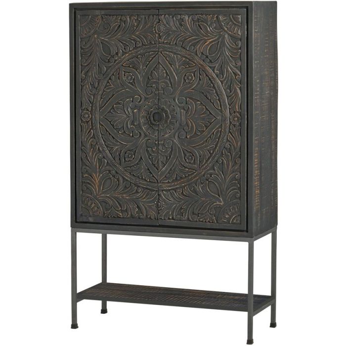 | Specificaties | Materiaal: Massief mangohout - Zwart - gelakt Materiaal 2: Deuren - Handgesneden mangohout - Black antique Materiaal 3: Frame metaal - Zwart - gepoedercoat W (cm): 110 D (cm): 41 H (cm): 190 |