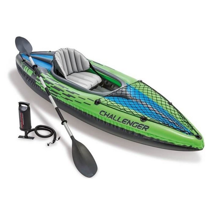 De Intex Challenger éénpersoons Kayak is een stevige, gestroomlijnde opblaaskayak. Deze kayak is zeer geschikt voor vaartochtjes op meertjes, rivieren of rustige open zee. Door de twee vinnen aan de onderkant is het gemakkelijk om recht te blijven koersen. De kayak is prima bestand tegen benzine, olie en fel zonlicht omdat het van stevig materiaal is gemaakt. Peddels, pomp en opbergtas worden bij deze kayak bij geleverd.