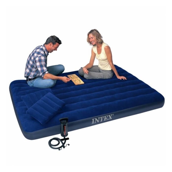Een Intex Classic Downy luchtbedset, met Dura-Beam binnenstructuur voor optimale lichaamsondersteuning, stabiliteit en slaapcomfort. Het Classic Downy luchtbed is gemaakt van duurzaam vinyl met een geflockte toplaag op het ligoppervlak. Het luchtbed is voorzien van een 2-in-1 ventiel, waardoor het snel op te pompen en is, en na gebruik ook weer snel leeg is. Het tweepersoons luchtbed wordt geleverd met 2 opblaasbare hoofdkussens en een handpomp.