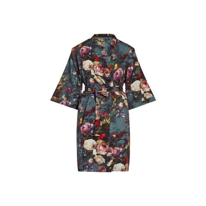 Met deze kimono stap je elke ochtend sierlijk uit bed. De Karli print is een design met een iconische bloemenprint zoals je van ESSENZA kan verwachten. De ontwerpers hebben een compositie gemaakt van bloemen van verschillende schilderijen uit het archief van de Oude Meesters. Deze print heeft een ontzettende hoeveelheid aan kleuren waar je eindeloos naar kan staren en laat zich daarom uitermate goed combineren met alle kleurtjes in je kast. De kimono valt tot op de knie, heeft elegante driekwartsmouwen en sluit met een strikceintuur. Gemaakt van 100% katoen satijn en dat zit heerlijk en kleed ook nog eens mooi af. De stof voelt soepel, glad en heeft een lichte glans.