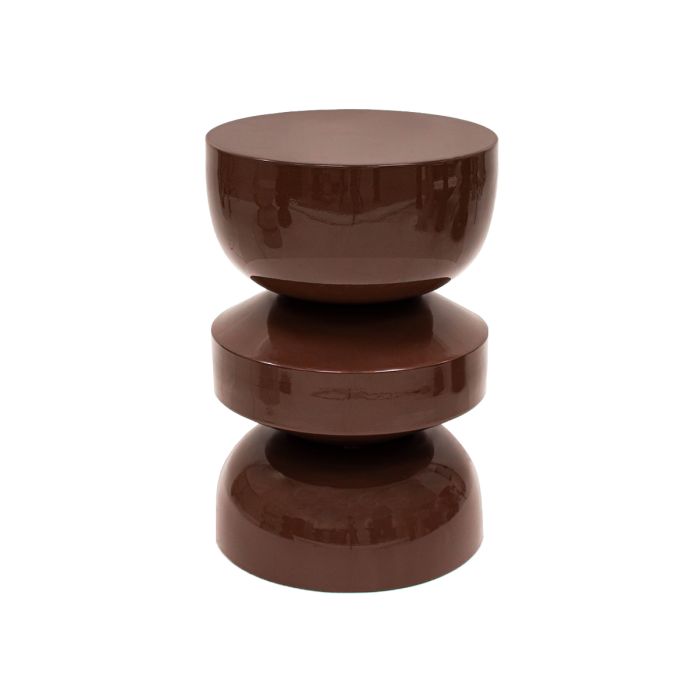 Bijzettafel ESRA: sculpturaal, gelaagd metalen design met glanzende finish. Multifunctioneel en robuust, Ø30 × H45 cm, verkrijgbaar in vier kleuren. Luxe eyecatcher, ideaal solo of gecombineerd met bijzettafel JON.