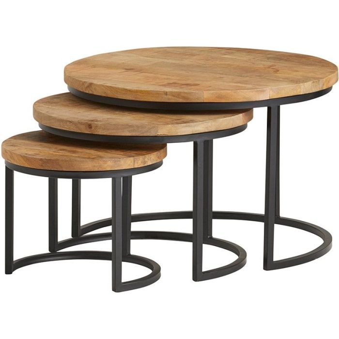 Materiaal: Massief mangohout - Naturel - gelakt Materiaal 2: Frame metaal - Zwart - gepoedercoat W (cm): 74/58/43 D (cm): 74/58/43 H (cm): 49/42/35