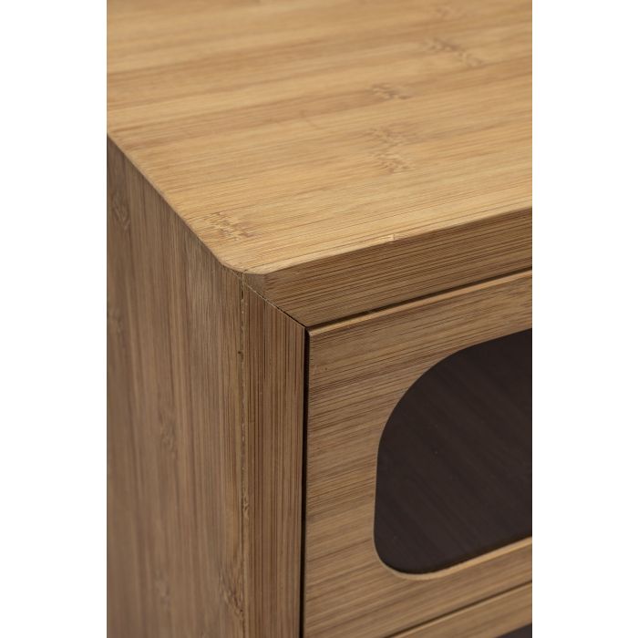 Met de Dutchbone Caroun serie maak je van jouw huis een knusse plek om samen te komen met geliefden of van je vrije tijd te genieten met een goed boek. Deze meubels van gecarboniseerde bamboe geven door het natuurlijke materiaal namelijk direct warmte af. De warme uitstraling van deze kasten, spiegels en tafel wordt daarnaast extra versterkt door de ronde vormen en afgeronde hoeken die duidelijk bij alle meubels uit de serie terugkomen. Daarnaast vormt het rookglas in de lades en deuren van de kasten een knipoog naar de jaren 70, wat de meubels een subtiel retro tintje geeft. Â