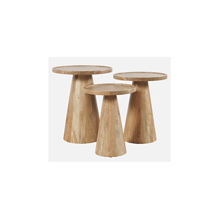 Deze set van drie bijzettafels, gemaakt van naturel mangohout, heeft een strak en warm ontwerp. De diverse hoogtes zorgen voor veelzijdigheid: ideaal als decoratieve set of apart te gebruiken. Het eenvoudige en stijlvolle design past in elke moderne of klassieke ruimte. Een functionele, decoratieve toevoeging aan elke woonkamer.