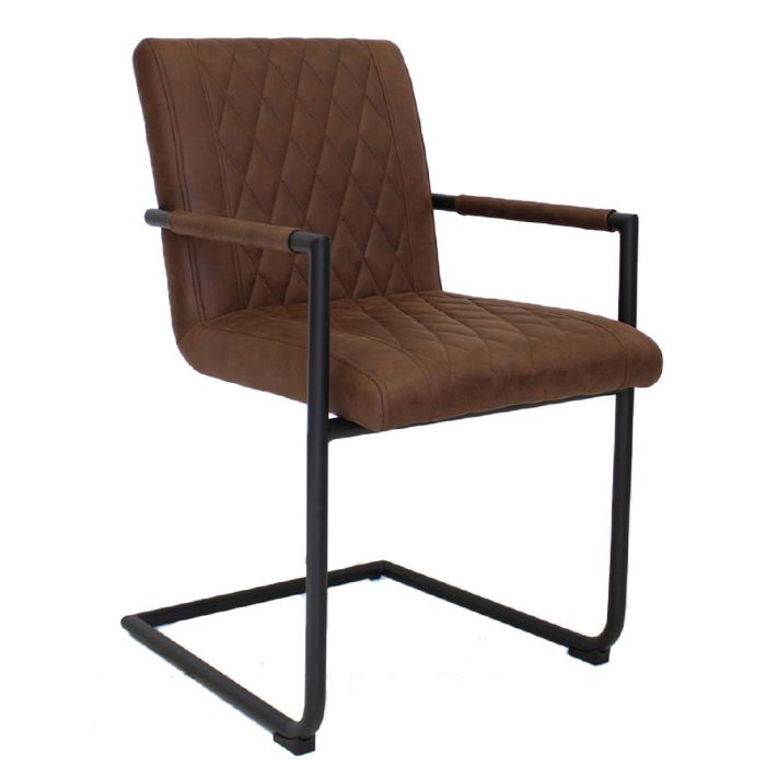 Industriële eetkamerstoel Dean bruin: microvezelzitting met klassiek ruitpatroon op zwart gepoedercoat stalen frame. Duurzaam, kleurvast en onderhoudsarm; vloerdoppen en viltjes inbegrepen. Vintage loft-uitstraling, eenvoudige montage (±6 minuten). Verkrijgbaar in bruin, cognac, taupe en antraciet.