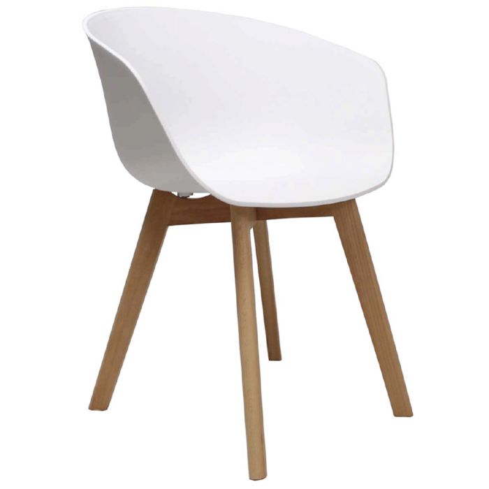 Scandinavische eetkamerstoel Herning: elegante, comfortabele kuipstoel met massief beukenframe en duurzame PP-kuip. Neutraal design (wit, zwart, grijs) past in moderne interieurs. Eenvoudige montage (4 schroeven) en inclusief vloerbescherming: doppen en viltjes.