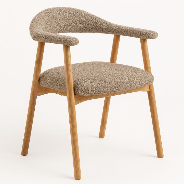Eetkamerstoel Suki: zandkleurige bouclé bekleding, comfortabele zitting met subtiele armleuningen en robuust metalen frame met eikenlook. Elegant Japandi/Scandinavisch design. Let op: bouclé kan haken; lichte kleur vereist meer onderhoud—advies: regelmatig stofzuigen.