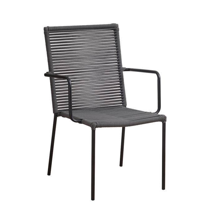 Tuinstoel Iza met armleuningen: tijdloos, modern en robuust. Laag, compact ontwerp met zwart metalen frame en antraciete, gevlochten polyester touw, sneldrogend. Optioneel kussen voor extra comfort. Reinigen met een lichtvochtige doek; geen chemische reinigers.